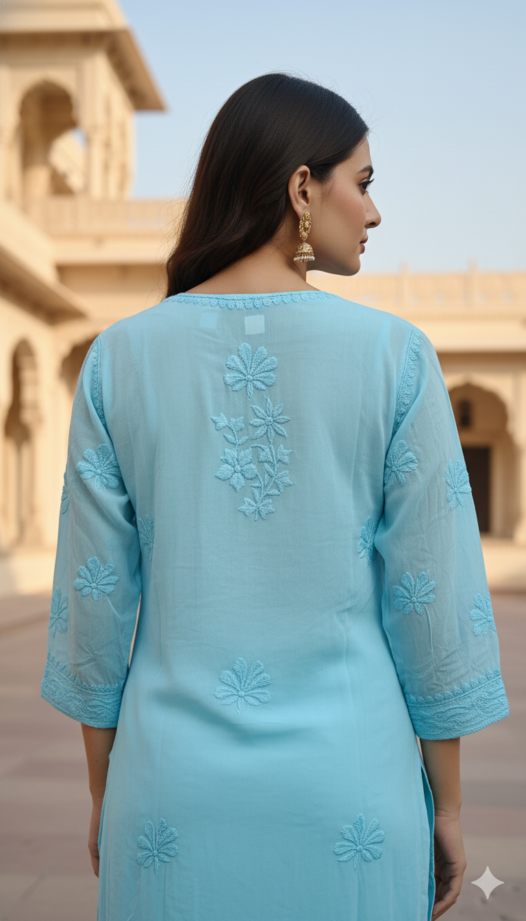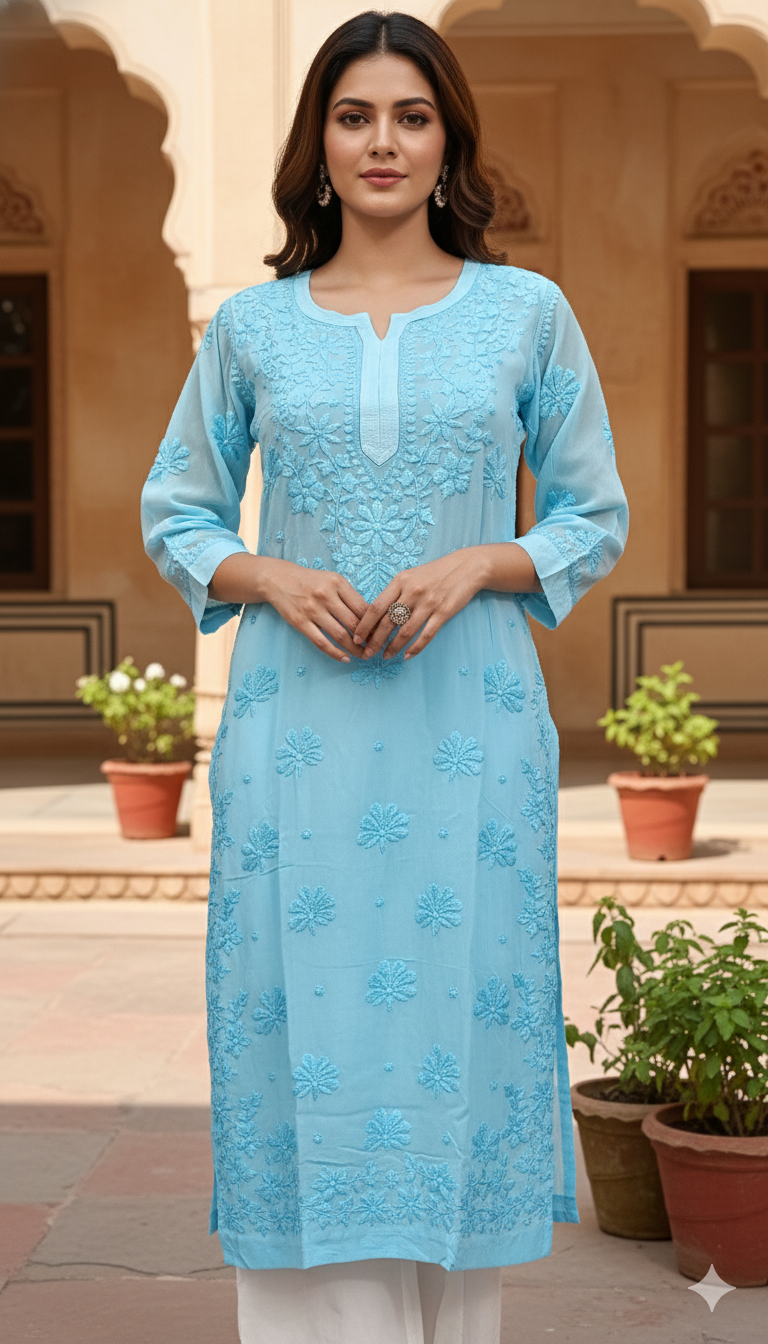 Experience timeless elegance with our Viscose Chikankari Long Blue Colour Kurta, crafted to celebrate the beauty of traditional Lucknowi craftsmanship. Made from premium-quality viscose fabric, this kurta offers a luxuriously soft feel, excellent breathability, and a graceful fall that enhances your silhouette throughout the day.