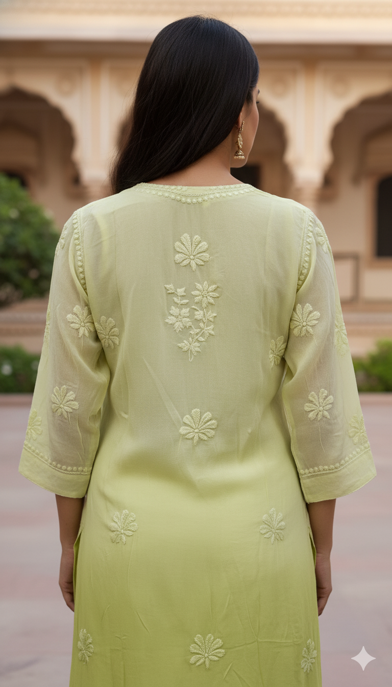 Experience timeless elegance with our Viscose Chikankari Long Pista Colour Kurta, crafted to celebrate the beauty of traditional Lucknowi craftsmanship. Made from premium-quality viscose fabric, this kurta offers a luxuriously soft feel, excellent breathability, and a graceful fall that enhances your silhouette throughout the day.
